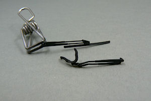 The finish line was looming on the horizon and there were a few small details I wanted to take care of before I assembled the car.For one, the antenna's provided in the kit were a bit out of scale. The limiting factor is the production process, which has nothing to do with Tamiya not doing a good enough job. There are some aftermarket accessoires available from Sakatsu, but these parts are really popular and almost always sold out. So I decided to make my own antenna's using the kits parts as base and some 0.13 mm thin steel wire.